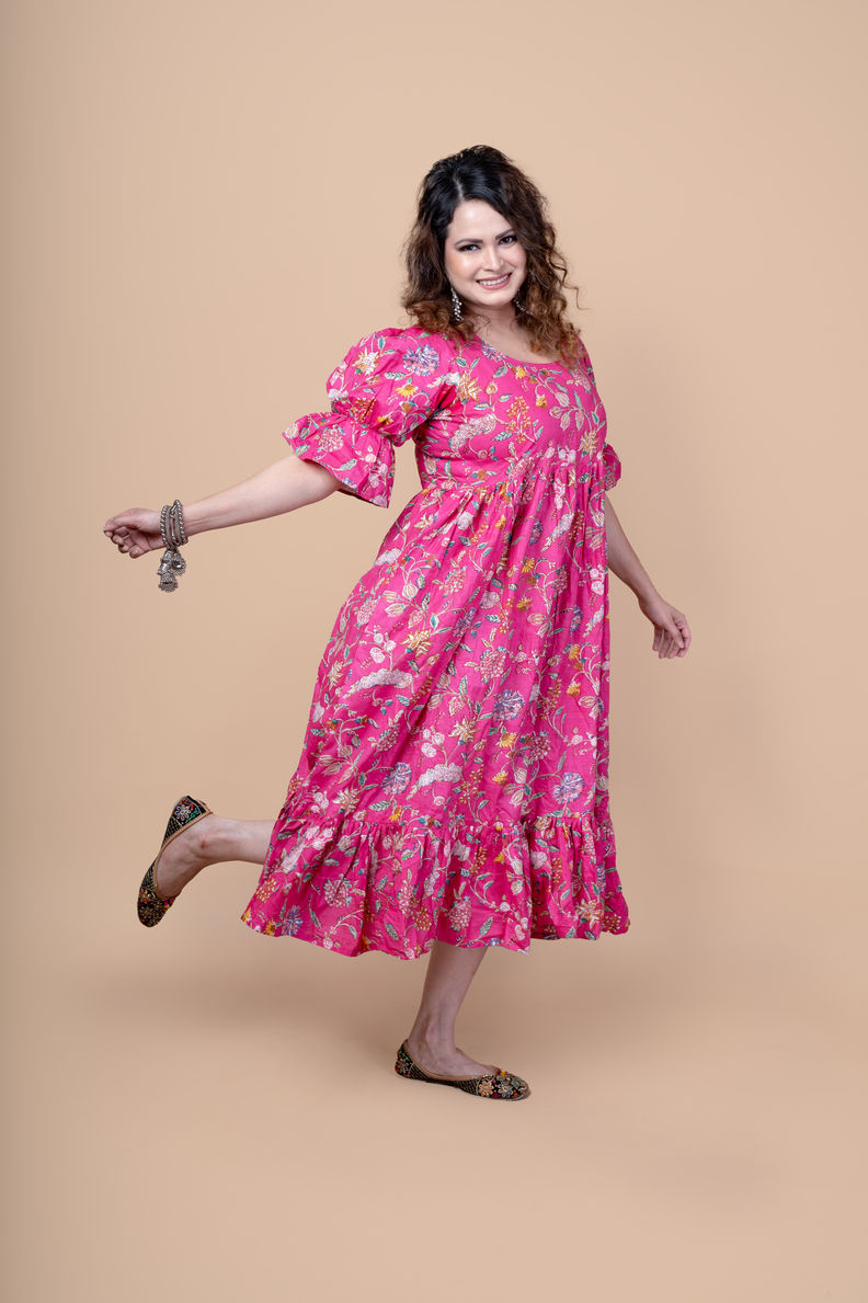 Bright, breezy, and effortlessly elegant—the Gulaabi Grace is a must-have dress for your wardrobe. Designed in a stunning pink floral print, this flowy midi dress features puff sleeves, a relaxed fit, and a ruffled hem for that extra touch of charm. Made with breathable, lightweight fabric, it’s perfect for warm days, casual outings, or just twirling around in joy.
